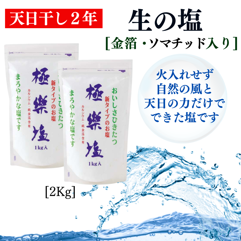 天日干し2年 火入れしない生の塩 「極楽塩」 1kg×2袋 金箔 貝カルシウム入り 食べる楽しさを極め こだわりの製法 塩 食塩 食卓塩 海塩 調味料 ミネラル ソルト