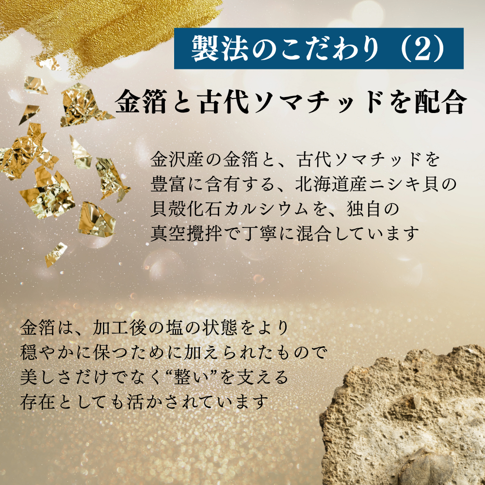 極楽塩には、金沢産の金箔と、古代ソマチットを豊富に含有する、北海道産ニシキ貝の貝殻化石カルシウムを、独自の真空攪拌で丁寧に混合しています。金箔は、加工後の塩の状態をより穏やかに保つために加えられたもので、美しさだけでなく“整い”を支える存在としても活かされています。