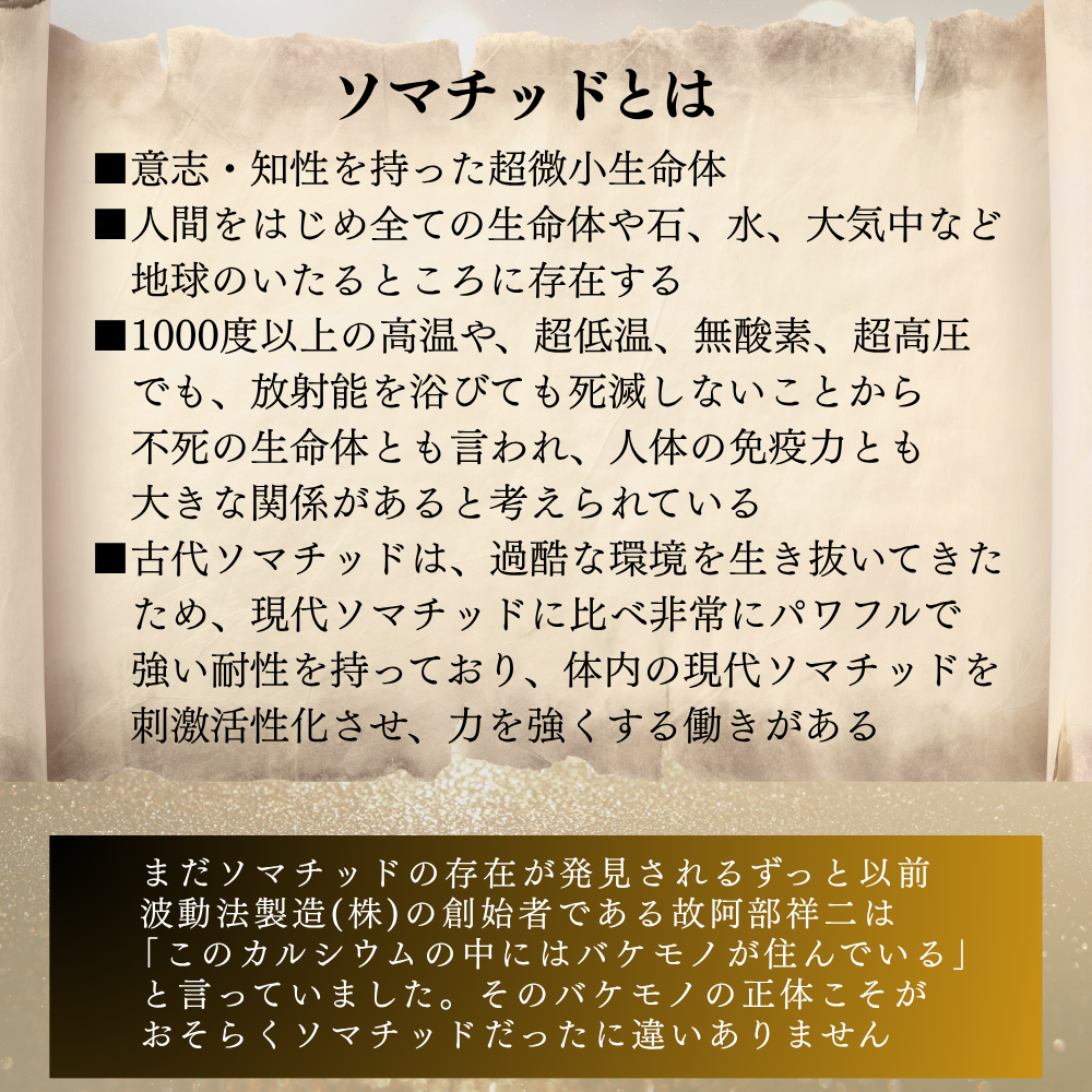 まだソマチッドの存在が発見されるずっと以前、波動法製造(株)の創始者である故阿部祥二は、「このカルシウムの中にはバケモノが住んでいる」と言っていました。そのバケモノの正体こそが、おそらくソマチットだったに違いありません。