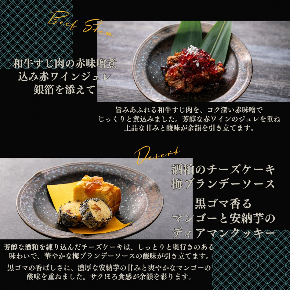 | 原材料名 | [うなぎの洋風押し寿司]うなぎ(鹿児島県産),たれ(醤油(小麦,大豆),みりん(米,もち米,米こうじ,その他),糖類(水あめ,砂糖,果糖ブドウ糖液糖)、酵母エキス,でん粉,寒天),米,昆布,塩,オリーブオイル,パルメザンチーズ,ワイン,黒コショウ/酸化防止剤(亜硫酸塩),保存料(ゾルビン産K),(一部に小麦・大豆・乳成分を含む) [イタリア産海塩の塩豚グリーンマスタード]豚バラ肉(国産),塩,ピンクペッパー/配合調味料、(一部に豚肉を含む) [スモーク鴨の木の芽味噌焼き]あい鴨肉(中国),食塩,砂糖,香辛料,調味みそ(米みそ,みりん,清酒,ほうれん草,砂糖)/紅麹色素,調味料(アミノ酸等),香料,クチナシ色素,ポリリン酸Na,調味料(アミノ酸),酸化防止剤(ビタミンC),発色剤(亜硝酸Na),(一部に卵・ゼラチン・大豆を含む) [お野菜スティック]人参,大根,食塩 [数の子とモッツレラチーズのジェノベソース]塩数の子(ニシンの卵(カナダ産)),調味液(しょうゆ・砂糖・海水・かつおぶしエキス・発酵調味料),ナチュラルチーズ(生乳・食塩),れんこん(中国),バジルソース(バジル・植物油脂・プロセスチーズ(乳成分を含む)・ガーリックピューレ・ナチュラルチーズ・食塩)/PH調整剤,酸化防止剤(ビタミンンC),乳酸Ca,メタリン酸Na,ソルビトール,酸味料,メタリン酸Na、(一部に小麦・さば・大豆・ゼラチンを含む) [酒粕のチーズケーキ梅ブランデーソース]クリームチーズ(北海道産),全卵,グラニュー糖,牛乳,小麦粉,酒かす(米,米麹,醸造アルコール),白みそ(米,大豆,食塩,還元水飴),レモン汁(レモン)/酒精,香料,(一部に小麦・乳成分・卵・大豆を含む) [黒ゴマ香るマンゴーと安納芋のディアマンクッキー]小麦粉(国内製造),バター,粉糖,芋ピューレ(さつまいも),マンゴードライフルーツ(マンゴー,砂糖),アーモンドプードル,塩,卵白,黒ごま,グラニュー糖,(一部に小麦・乳成分・アーモンド・卵・ごまを含む) [和牛すじ肉の赤味噌トマト煮込み 赤ワインジュレ 銀箔を添えて]牛肉(国産),トマトピューレ,調合みそ(豆みそ(大豆・食塩),米みそ(大豆・食塩・米),水あめ),砂糖,みりん,ハチミツ,しょうゆ,濃縮還元ぶどう果汁(輸入ワイン),板状ゼラチン(豚の皮),銀箔/クエン酸カラメル色素,酒精,調味料(アミノ酸等)酸味料,酸化防止剤(亜硫酸塩),銀箔製剤、(一部に牛肉・大豆を含む) [鰆のクリームチーズ西京焼き]鰆(韓国産),味噌漬け用調味料(味噌,砂糖,甘酒,米発酵調味料,醸造酢),プロセスチーズ(生乳,食塩)/増粘剤(加工デンプン,キサンタン),乳化剤、(一部に小麦・乳製品・オレンジ・大豆を含む) [お野菜のグリル]ブロッコリー,サツマイモ,オリーブオイル,岩塩,オニオン,ブラックペッパー,ガーリック,セロリシード,タイム,オレガノ [アワビの肝バターグラタン]蝦夷アワビ(韓国産),ホワイトソース,(小麦粉,全粉乳,ショートニング,たまねぎ,生クリーム),ワイン,バター(生乳,食塩),ナチュラルチーズ,焼き菓子(小麦粉,食用植物油脂,砂糖,酵母,小麦グルテン)/増粘剤(加工デンプン),調味料(アミノ酸等),メタリン酸Na,香料,酸味料,酸化防止剤(亜硫酸塩,ビタミンc),保存料(ゾルビン酸k),セルロース、(一部に小麦・乳成分・大豆を含む) [有頭海老の冷静アヒージョ]海老(インドネシア産),ホタテ貝柱,芽キャベツ,しょうゆ加工品(本醸造しょうゆ,ブドウ糖果糖液糖,還元水あめ,砂糖,食塩),ソース(食用植物油脂,おろしにんにく,食塩,砂糖,フライドガーリック),つゆ(しょうゆ,果糖ブドウ糖液糖、砂糖、食塩、たん白加水分解物)/アルコール,調味料(アミノ酸等),増粘剤(加工デンプン,キサンタン),酸味料,香料(一部に小麦・さば・大豆・乳成分・鶏肉を含む) [黒毛和牛の自家製ローストビーフ秘伝だれ]牛肉(国産)、本醸造醤油(国内製造)、食塩、胡椒、ガーリックパウダー、ぶどう糖果糖液糖、還元水飴、醸造酢、かきエキス、海苔、たん白加水分解物、酵母エキス、こんぶエキス、ふし(かつお節、かつお削り節)、/アルコール、調味料(アミノ酸等)、(一部に牛肉・小麦・大豆を含む) |