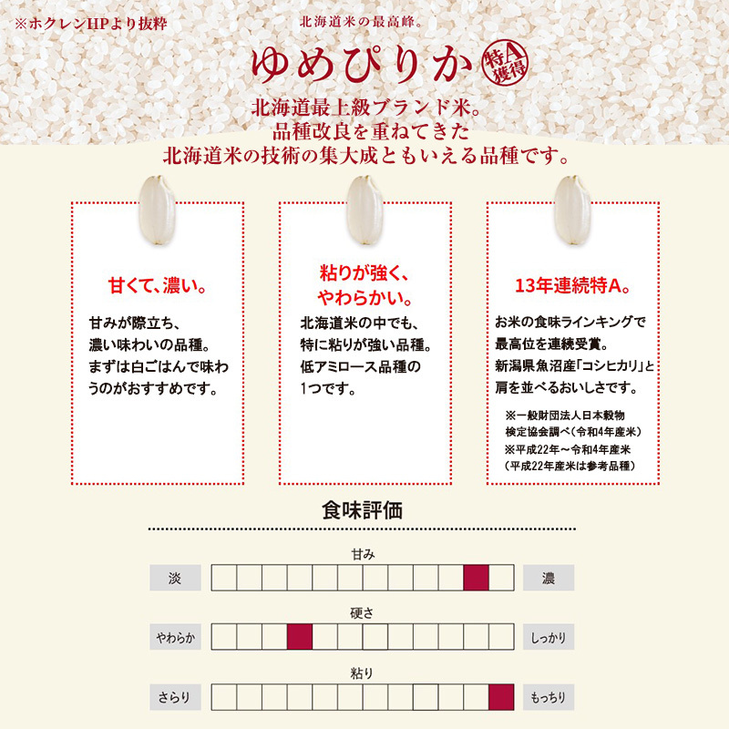 10年以上の歳月をかけて研究をすすめ、そのおいしさを追求することで、これまでになかった北海道米の開発に成功しました。ほどよい粘りと甘み、やわらかさ、そしてつややかな炊きあがりの美しさを持つ北海道米の最高峰「ゆめぴりか」は、まさに、ごはんそのものがご馳走になるお米です。