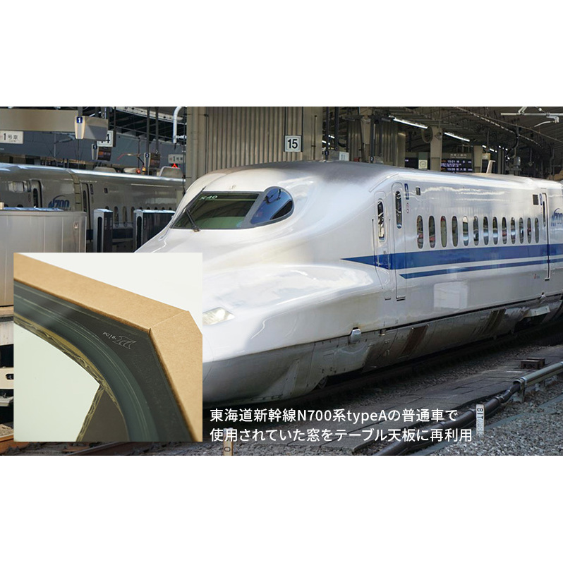 実際に東海道新幹線N700系typeAの普通車で使われていた窓を天板に再利用。廃棄されるはずだった窓を、丁寧に修復し磨き上げて使用しています。