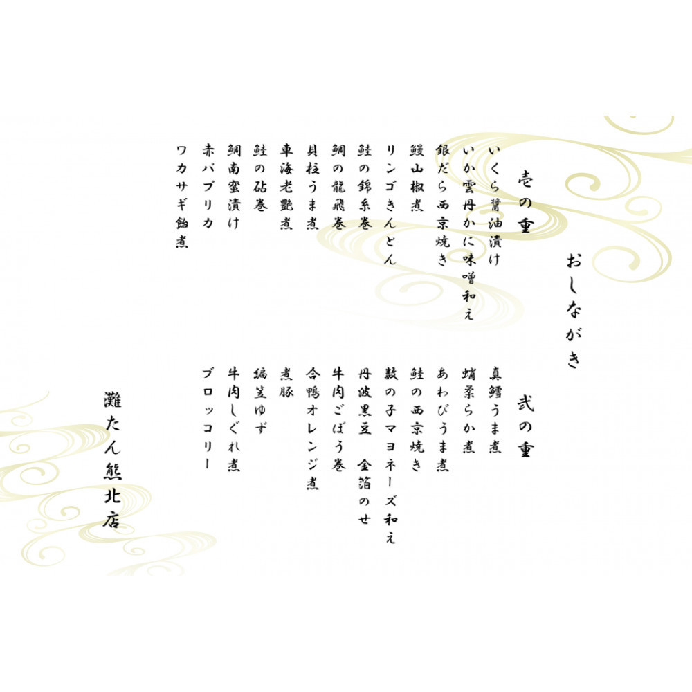 | 原材料名 | りんごきんとん(さつま芋(国産)、りんご(国産)、水あめ、砂糖、レモン果汁、食塩)、煮豚、黒豆煮、牛肉時雨煮、数の子わさびマヨネーズ和え、真だら煮、牛肉ごぼう巻、合鴨オレンジ煮、貝柱煮、鯛南蛮漬、銀だら西京焼、鮭西京焼、鰻山椒煮、車海老煮、いくら醤油漬、鯛龍飛巻(酢〆鯛、酢漬昆布、甘酢生姜)、鮭砧巻(酢〆鮭、甘酢大根)、鮭錦糸巻(酢〆鮭、薄焼卵、甘酢生姜)、いか雲丹かに味噌和え、網笠柚子、あわび煮、ブロッコリーお浸し、わかさぎ飴煮、パプリカ甘酢漬/調味料(アミノ酸等)、保存料(しらこ)、着色料(クチナシ、金箔、野菜色素)、甘味料(ステビア、ソルビット)、ゲル化剤(ペクチン)、増粘剤(加工でんぷん、増粘多糖類)、グリシン、酢酸Na、酸味料、ソルビット、トレハロース、香料、酒精、増粘多糖類、香辛料抽出物、pH調整剤、乳化剤、(一部にえび・かに・小麦・卵・乳成分・あわび・いか・いくら・オレンジ・牛肉・さけ・さば・大豆・豚肉・りんごを含む) |