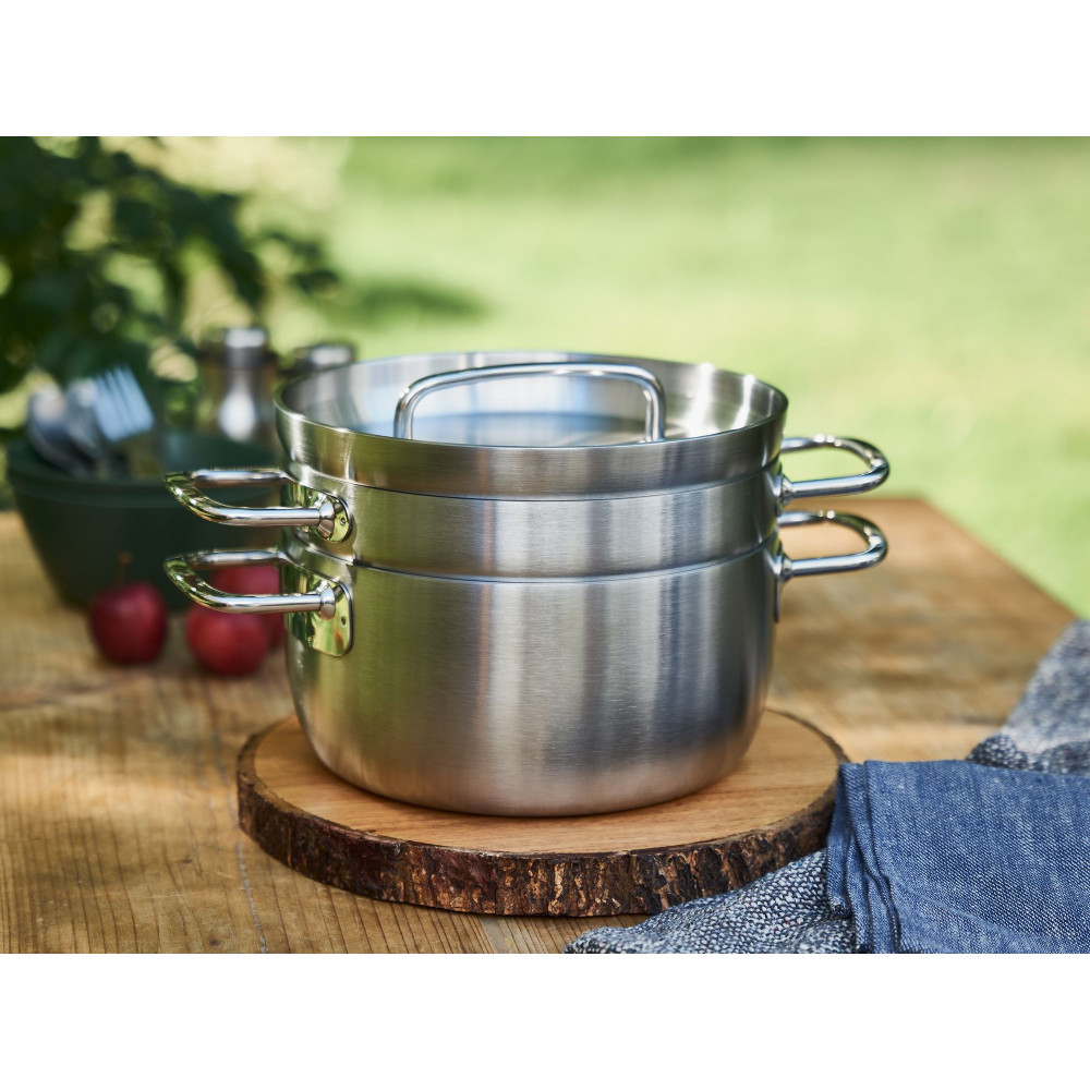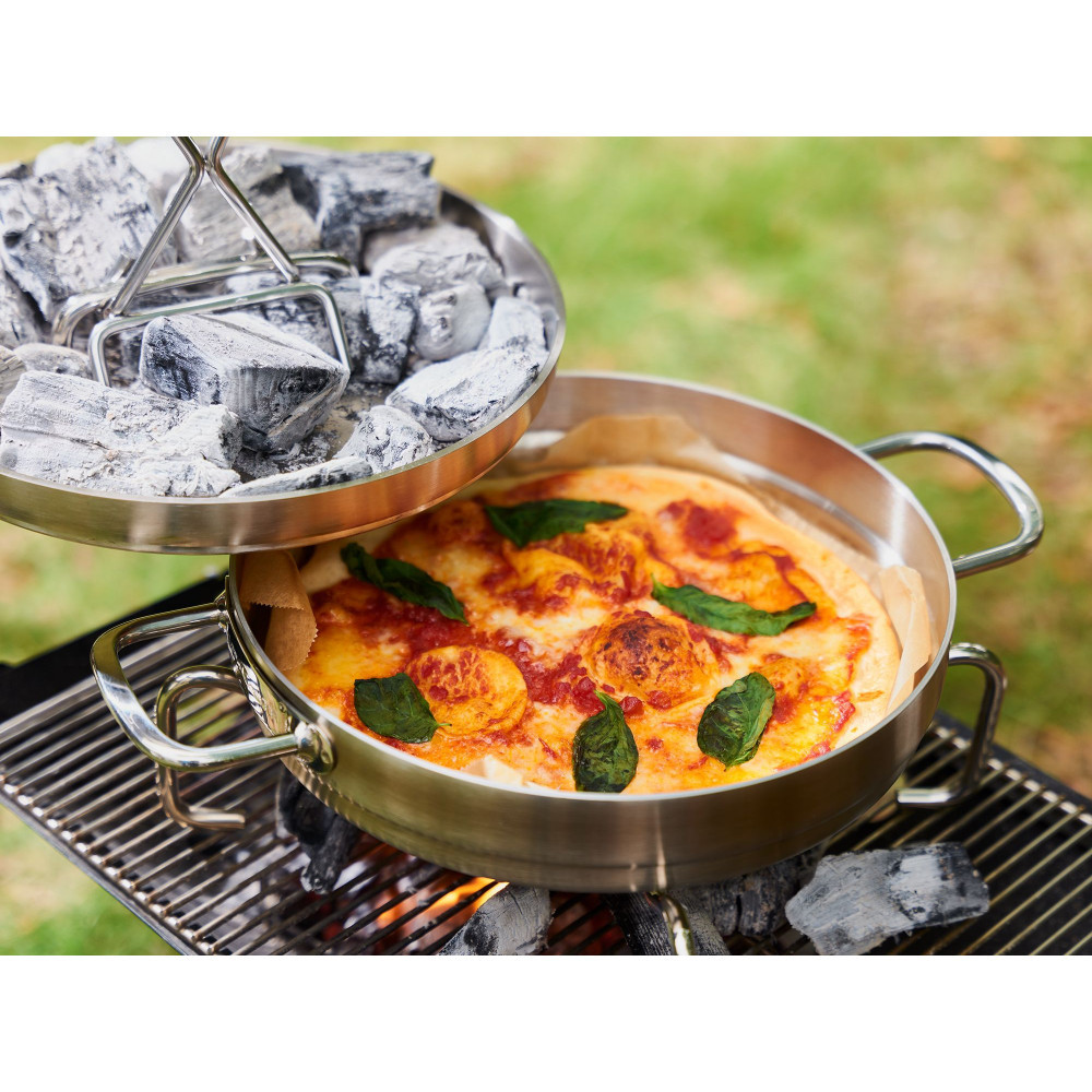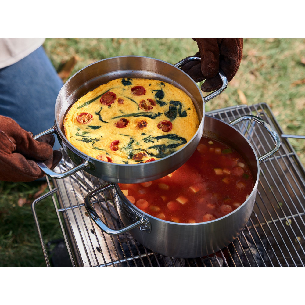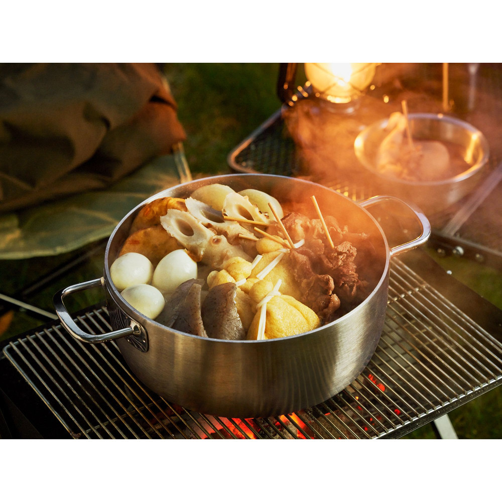 ビタクラフトの高性能をアウトドアでも楽しめるステンレス製ダッチオーブン。鋳鉄製と違って軽量で錆びにくく、シーズニングなどの面倒なお手入れが不要。全面5層構造の熱効率の良さで、オーブン調理・煮込みなどダッチオーブンならではの多様な料理が美味しく仕上がります。深鍋と浅鍋の2つの鍋がセットになっており、料理に合わせて使い分けでき、コンパクトに収納して持ち運び可能。リフターやスタンドなど付属品も充実しているので、ダッチオーブン初心者でも安心です。キッチンや食卓に映える美しいデザインなので、アウトドアはもちろん、ご自宅での普段使いにも活用できます。