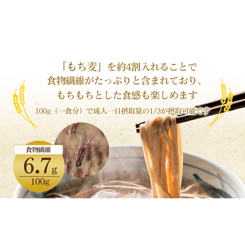 食物繊維の豊富な愛媛県東温市産「もち麦」を国内産小麦に約4割混ぜ合わせたもちもち食感の麺です。「もち麦」を約4割入れることで、食物繊維も6.7g/100gとたっぷり含まれています。(成人の一日摂取量の約1/3に当たります。)