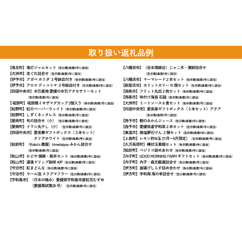 愛媛県が誇る、グルメや雑貨品など、さまざまな自慢の逸品を厳選掲載したカタログギフトです。