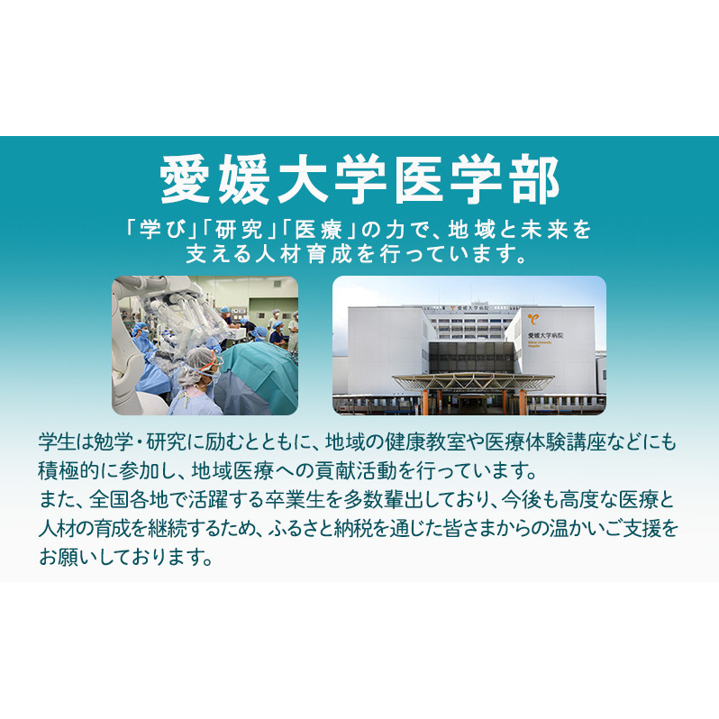 寄附金は、愛媛大学医学部学生、研究者及び医療従事者への支援事業に活用させていただきます。