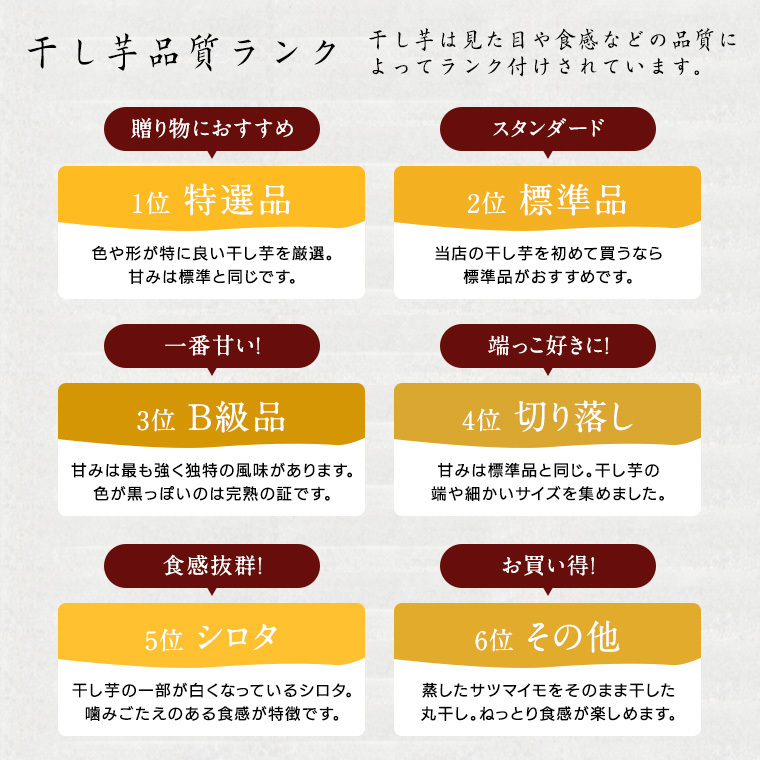 干し芋は自然食品の為、同一品種でも収穫時期、天候等により、大きさ、形、硬さ等に違いが出てしまう事があります。白い粉は干し芋に含まれる麦芽糖が結晶化したものです。芋の皮やひげ根の付着、繊維や黒ずみが見られることがありますが、いずれも品質には問題御座いませんので、ご安心してお召し上がり下さい。