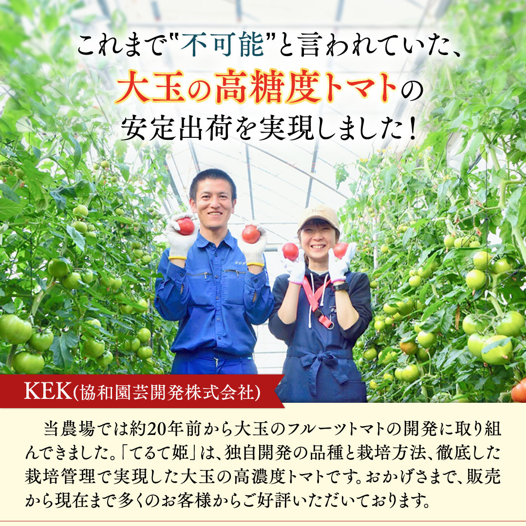 「まるでフルーツ!」と驚きの声続出。野菜ソムリエサミットで2年連続金賞に輝いた、特別なフルーツトマトをお届けします。長い年月をかけて独自開発した、他では味わえない大玉の「てるて姫」。一口食べれば、その濃厚な甘さとジューシーな果肉に、きっとあなたも虜になるはずです。