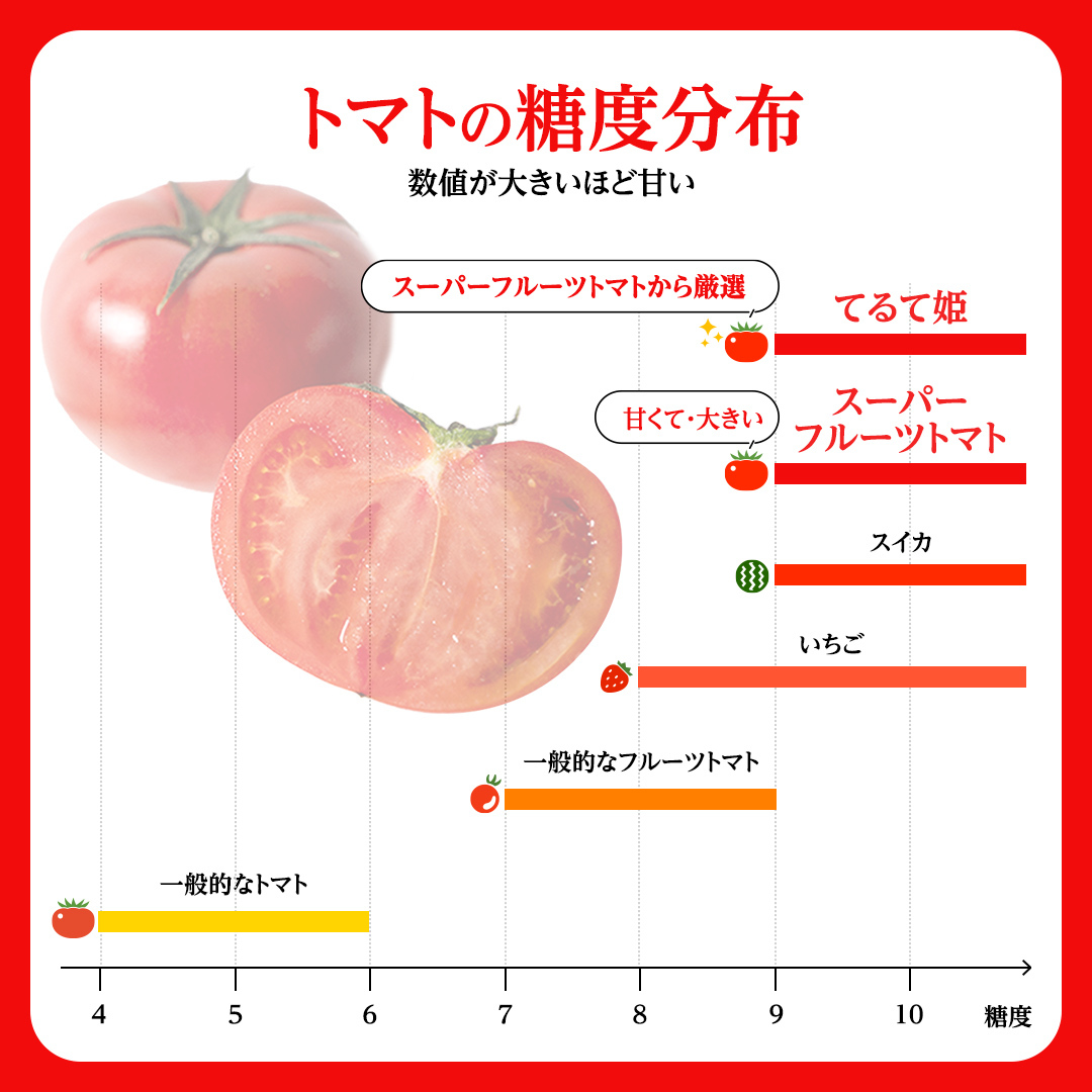 美味しさの秘密は、徹底した品質管理。光センサー搭載の選果機で、トマトひとつひとつ丁寧に糖度を計測。糖度9度以上※の基準をクリアしたものだけを厳選してお届けします。口にした瞬間に広がる、とろけるような甘みと凝縮された旨み。太陽の恵みをたっぷり浴びた「てるて姫」は、まさに自然のスイーツです。