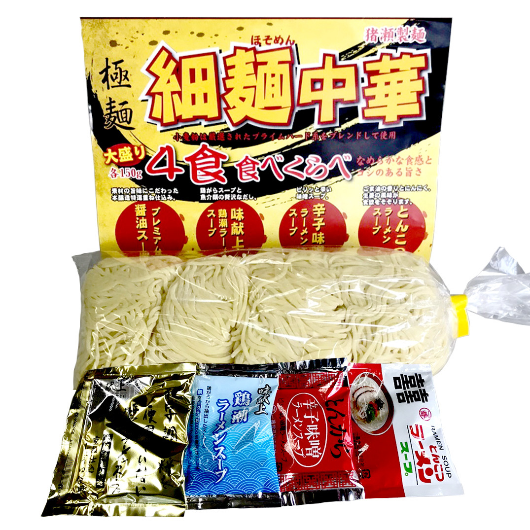 (細麺セット) 麺:150g×4食 ラーメンスープ:4種各1個(プレミアム醤油・味献上鶏潮・辛子味噌・とんこつ)