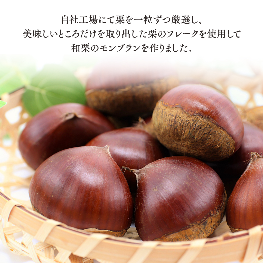 自社工場にて栗を一粒ずつ厳選し、美味しいところだけを取り出した栗のフレークを使用して和栗のモンブランを作りました。
