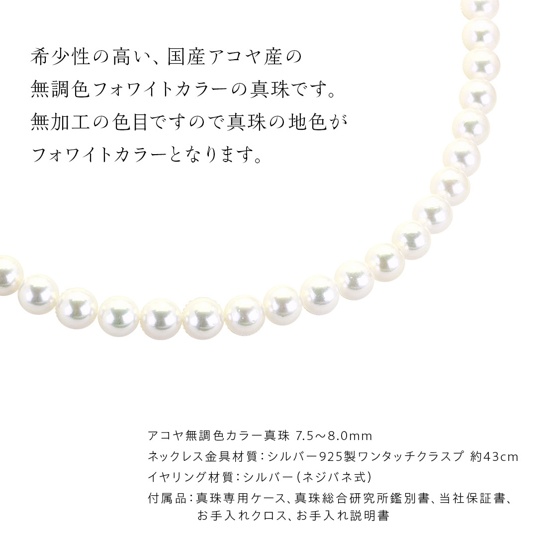 アコヤ真珠《 ネックレス + イヤリング セット 》 パール 7.5-8.0mm 希少 国産 無調色 フォワイトカラー 真珠 結婚式 冠婚葬祭 成人祝い 結婚祝い 厄除け 真珠婚 お祝い 入学式 卒業式 プレゼント ギフト 記念 贈り物 贈答用 アクセサリー ジュエリー ジュエリーマーノ 桜川市 [AH156sa]