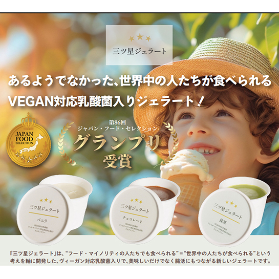 2024年11月6日より販売開始した、フード・マイノリティの人たちでも食べられる『三ツ星ジェラート』が、2025年4月15日に第86回ジャパン・フード・セレクショングランプリを受賞しました。