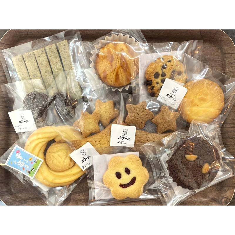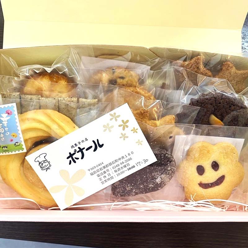 ボナール定番のクッキー、塩サブレ、ディアマン・ショコラ、ガレット、フィナンシェ、その他季節限定の焼菓子など、焼菓子の店ボナールの自慢の焼菓子をお送りいたします。