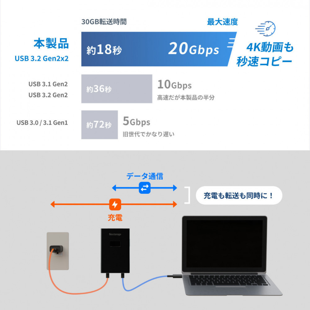 最大20 Gbpsの転送速度で、30 GBのデータであれば約18秒で転送します。