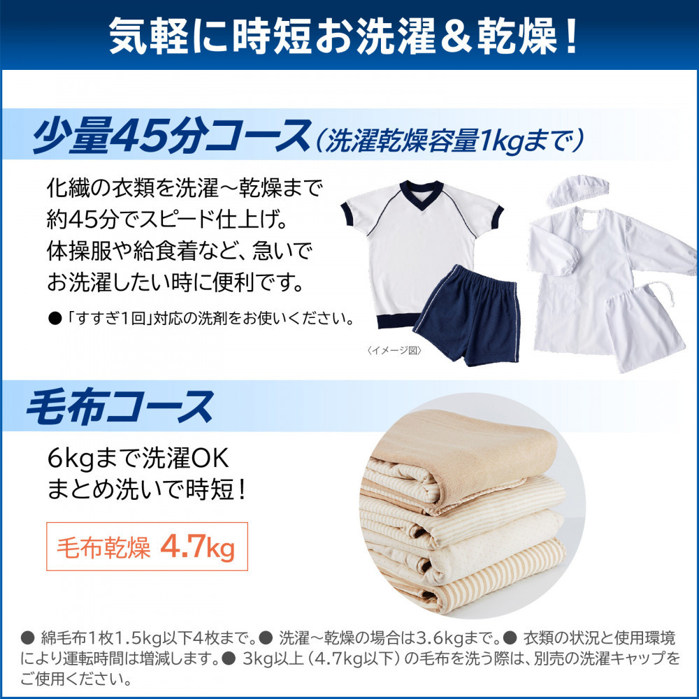 ゆとりの大容量で大きな洗濯物も、まとめ洗いも。
