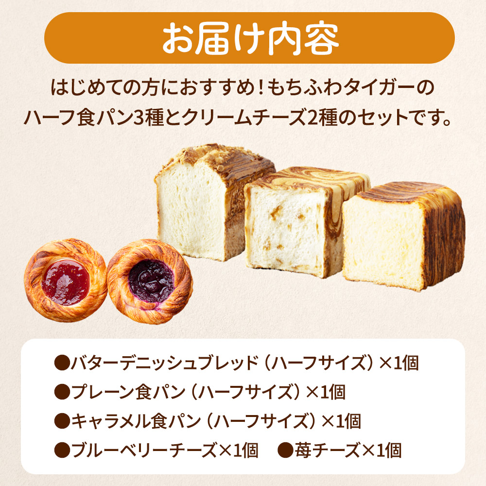 もちふわタイガー おすすめセットA(バターデニッシュブレッドハーフ、プレーン食パンハーフ、キャラメル食パンハーフ、ブルーベリーチーズ、苺チーズ)