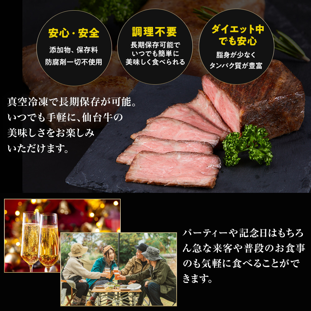 厳選された宮城県の銘柄牛300グラム。 仙台牛を、低温でゆっくり火を通して旨味を閉じ込めました。是非ご賞味ください。 冷蔵庫で約8時間解凍し、お好みの厚さにカットしてお召し上がりください。