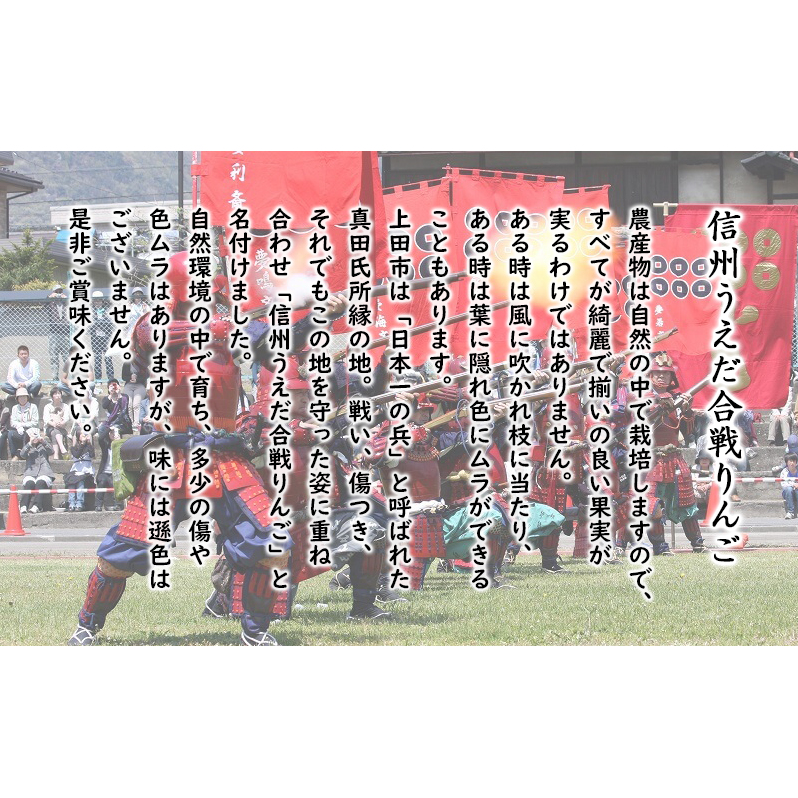 農産物は自然の中で栽培しますので、すべてが綺麗で揃いの良い果実が実るわけではありません。ある時は風に吹かれ枝に当たり、ある時は葉に隠れ色にムラができることもあります。上田地域は「日本一の兵」と呼ばれた真田氏所縁の地。戦い、傷つき、それでもこの地を守った姿に重ね合わせ「信州うえだ合戦りんご」と名付けました。自然環境の中で育ち、多少の傷や色ムラはありますが、味には遜色はございません。是非ご賞味ください。
