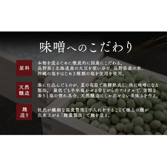 原料は地元の契約栽培を中心にすべて国産。手造り、天然醸造、無添加のこだわり信州味噌。