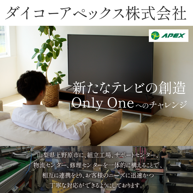 「新たなテレビの創造」、「Only One」へのチャレンジを掲げて取り組んでいます。 山梨県上野原市に、組立工場、サポートセンター、物流センター、修理センターを一体的に構えることで、相互に連携をとり、お客様のニーズに迅速かつ丁寧な対応ができるようにしております。