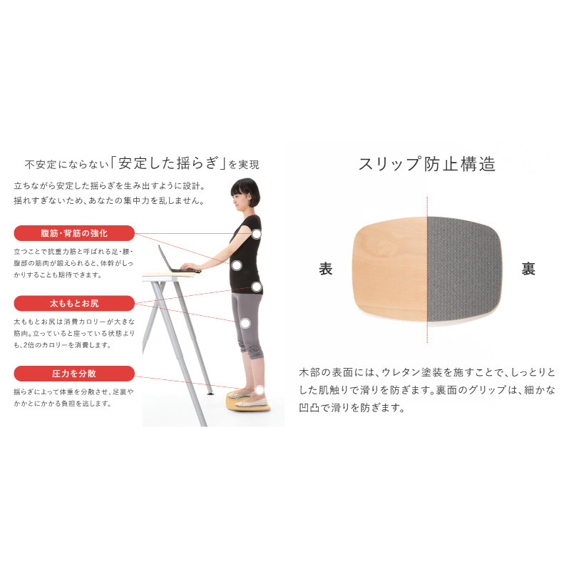 不安定にならない、安定した左右への揺らぎを実現し、立ちっぱなしの足をサポートします。