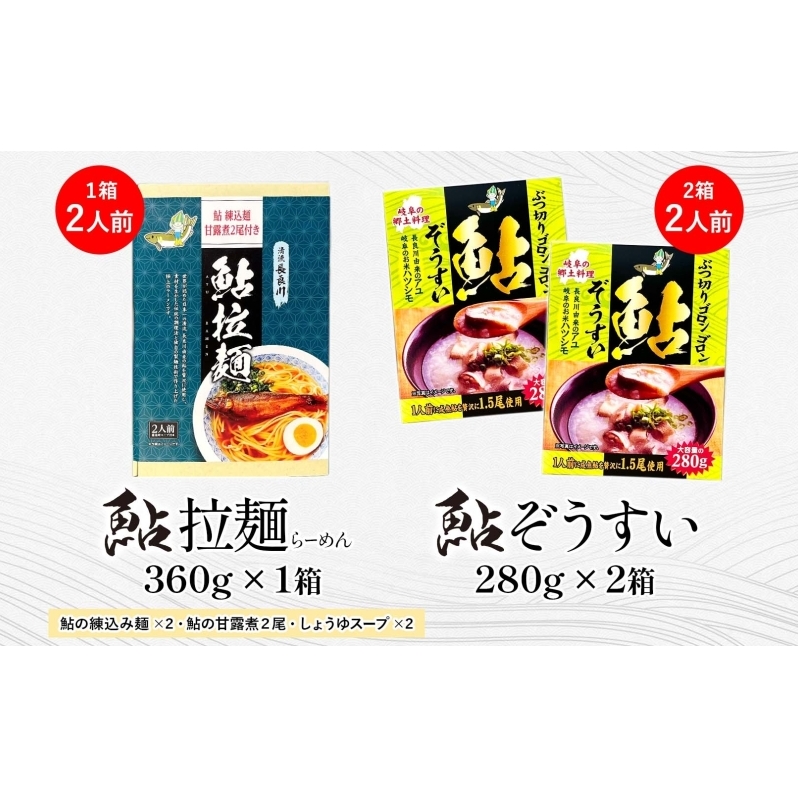 鮎拉麺・鮎ぞうすいセット 鮎 あゆ アユ ラーメン ぞうすい 雑炊 しまだ麺 麺 ご当地 グルメ お取り寄せ 和食 甘露煮 美濃ハツシモ 魚粉 旨味 魚 料理 簡単 一般財団法人岐阜県魚苗センター 岐阜県 美濃市