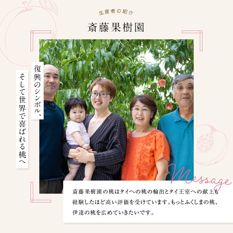 東日本大震災後は、福島県初の海外輸出品としてタイのデパートで販売し、タイの王室にも献上した桃です。