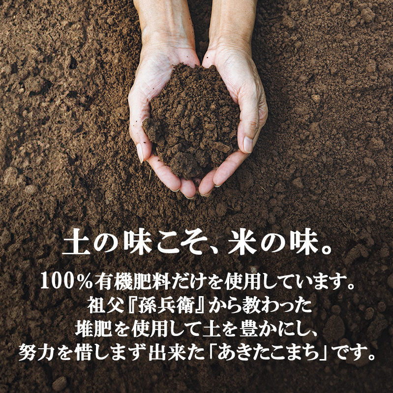 食味にこだわって、栽培期間中100%完全有機米肥料使用。祖父「孫兵衛」から教わった堆肥を使用して土を豊かにし、努力を惜しまずできたあきたこまちです。