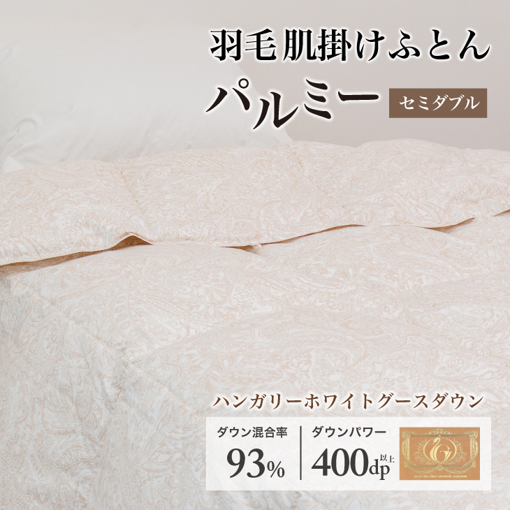 詰め物は、ダウン混合率93%、ダウンパワー400dp以上、ロイヤルゴールドラベル付きのハンガリーホワイトグースダウン。