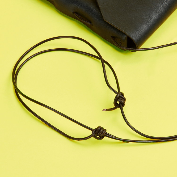 革紐のストラップが本体の底を覆うように通っているため安心感がありストラップの長さは結び目を横に引くことで長さの調節が可能です。