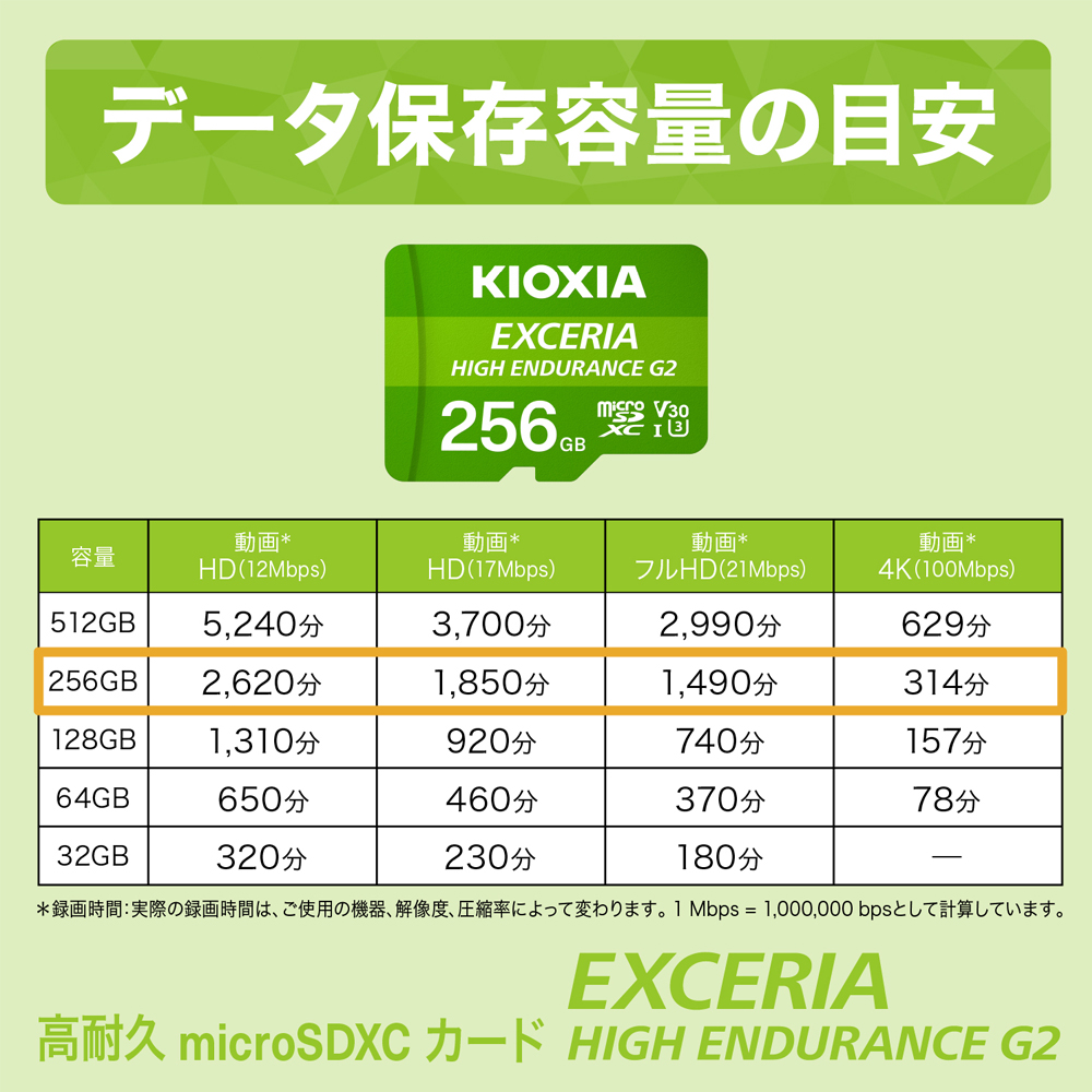 キオクシア(KIOXIA)EXCERIA HIGH ENDURANCE G2 高耐久 microSDHC/microSDXC UHS-Iメモリカード 256GB【エクセリア、メモリ、カード、ストレージ、SD、マイクロSD、録画、長時間、4K、品質、三重県、四日市市、ふるさと納税】