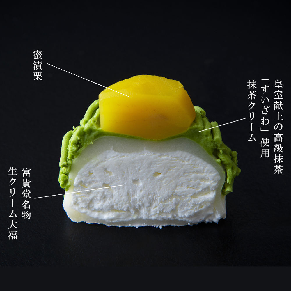 その下部には、富貴堂の名物、口のなかでとろけるバニラの生クリーム大福を使用。