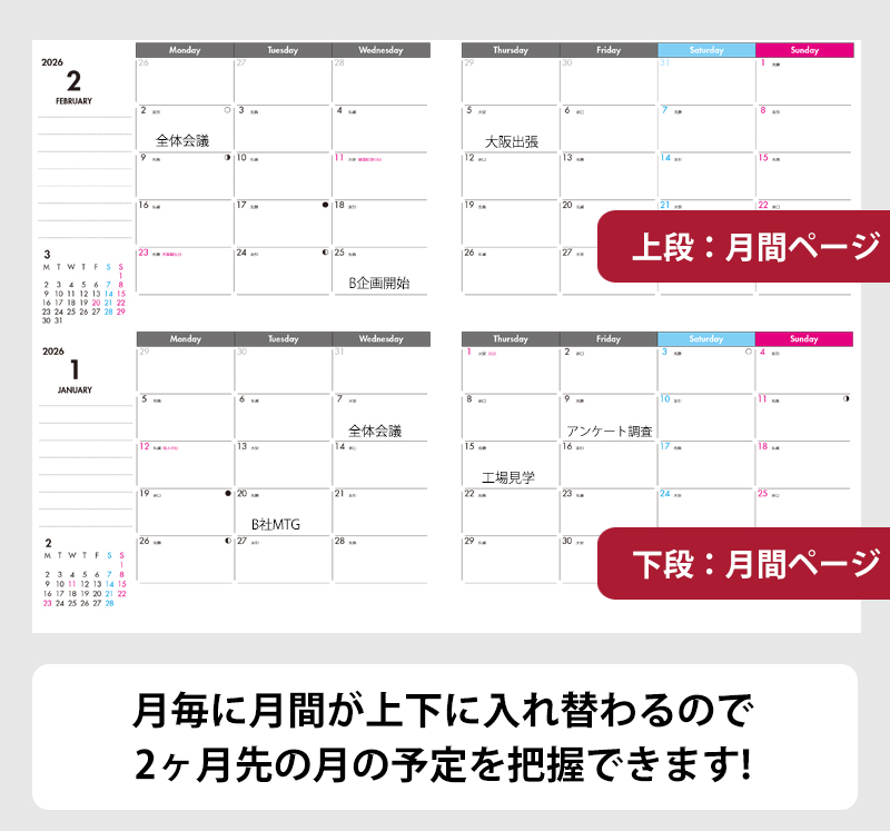上下ページの組み合わせにより「月間ページ」、「1日1ページ(デイリー)」、「ガントチャート」を同時に確認することができます。