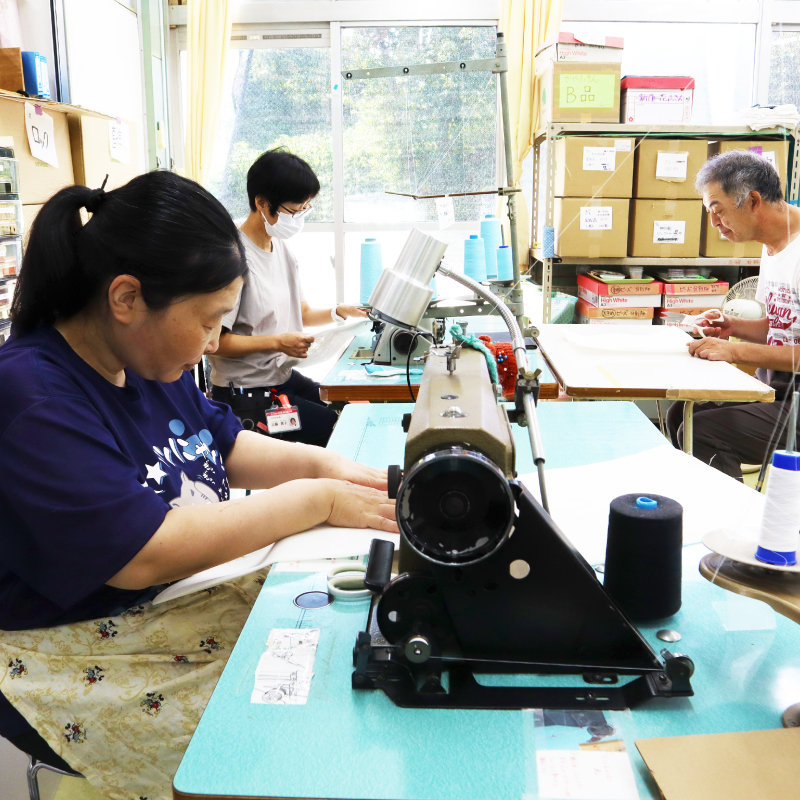 ミシン、折り、印つけ等、工程の中でそれぞれができることを一生懸命に行っています。