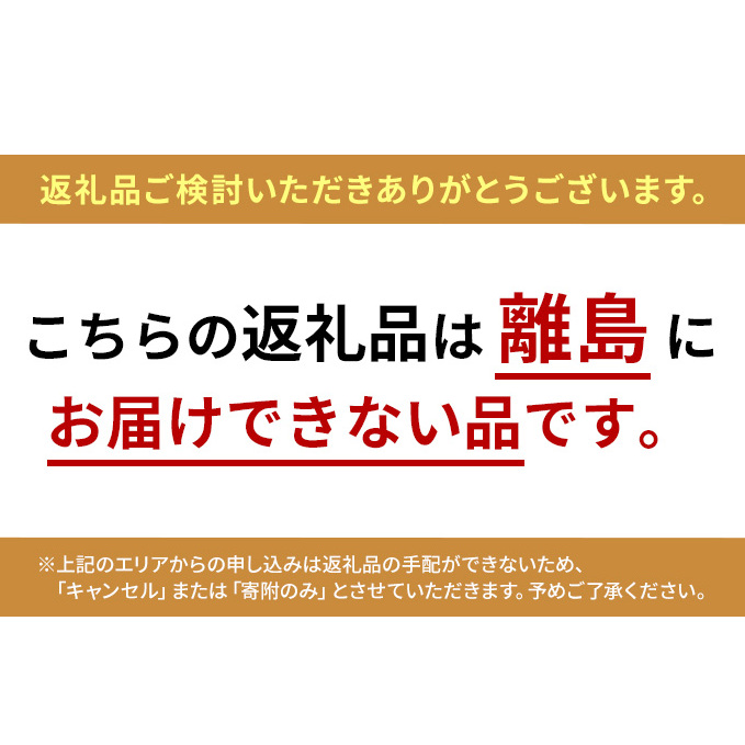 ※上記のエリアからの申し込みは返礼品の手配が出来ないため、「キャンセル」または「寄附のみ」とさせていただきます。予めご了承ください。