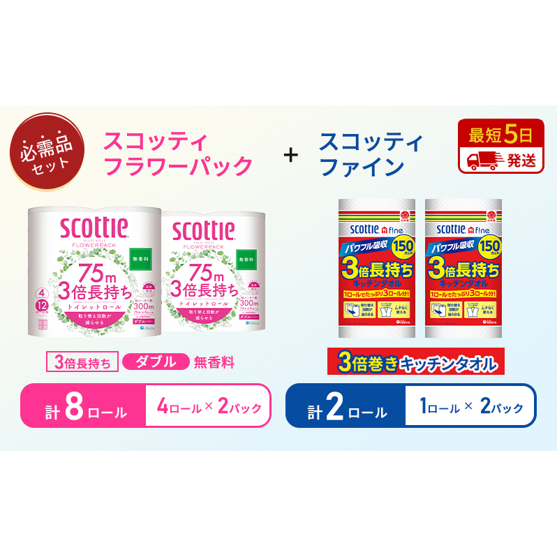 【特別寄附額/岩沼市オリジナル】キッチンペーパー 2パック入 スコッティ ファイン 1ロール 3倍 150カット トイレットペーパー ダブル 3倍 長持ち 4ロール入×2パック スコッティ フラワーパック 無香料 長持ち 防災 災害 日用品 生活用品 生活必需品