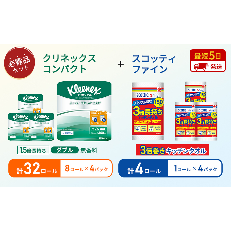 【特別寄附額/岩沼市オリジナル】キッチンペーパー 4パック入 スコッティ ファイン 1ロール 3倍 150カット トイレットペーパー ダブル 1.5 倍巻き 8ロール入×4パック クリネックス コンパクト 無香料 長持ち 防災 災害 日用品 生活用品 生活必需品