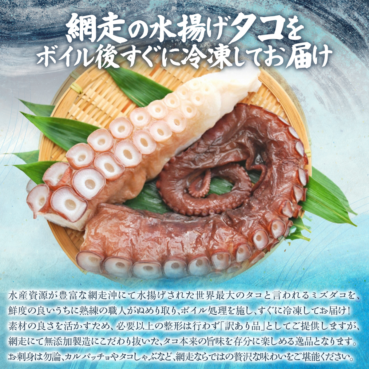 網走で水揚後、鮮度の良いうちにぬめり取りの作業を施し、熟練の職人により味と食感の決め手と成るボイル処理をした後、すぐに冷凍したタコ脚をお届けいたします。