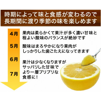 黄色い果実ですがやさしい甘さと酸味で春から夏まで柑橘の味を楽しめて時期ごとに味の変化も楽しめるさわやか柑橘です。