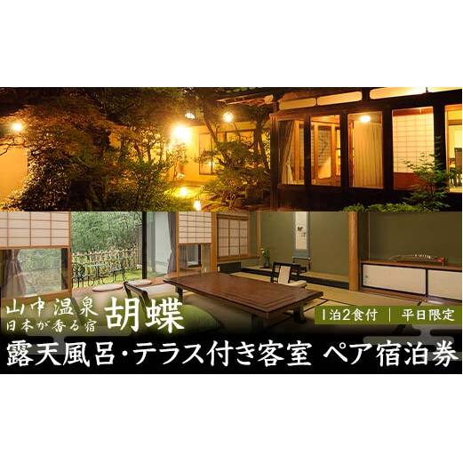平日限定 山中温泉 胡蝶 露天風呂 テラス付き客室 ペア宿泊券 1泊2食付 平日 ペア 2名 宿泊券 食事付き 温泉 宿泊 宿 旅館 ホテル 旅行 レジャー 観光 復興 震災 コロナ 能登半島地震復興支援 北陸新幹線 F6P-2044