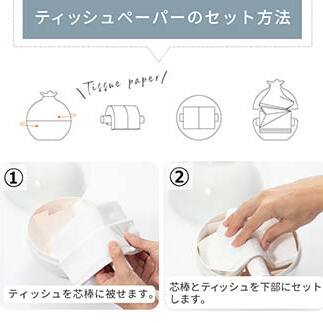 詰め替えは簡単! 箱入りや袋入りのティッシュを取り出して、かぶせるように入れるだけ。トイレットペーパーは芯棒に通すだけ。あっという間にセット完了!