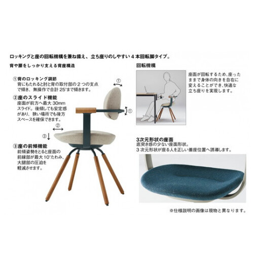一体化したフレームの肘部と背もたれに搭載した機構により、スムーズなロッキングを実現。前傾・直立・後傾・ストレッチ姿勢に自在に対応するだけでなく、背の動きに追従するように三次元形状のシートがスライドすることで、手動操作なしで、座る人を自然と正しいシートポジションに導きます。