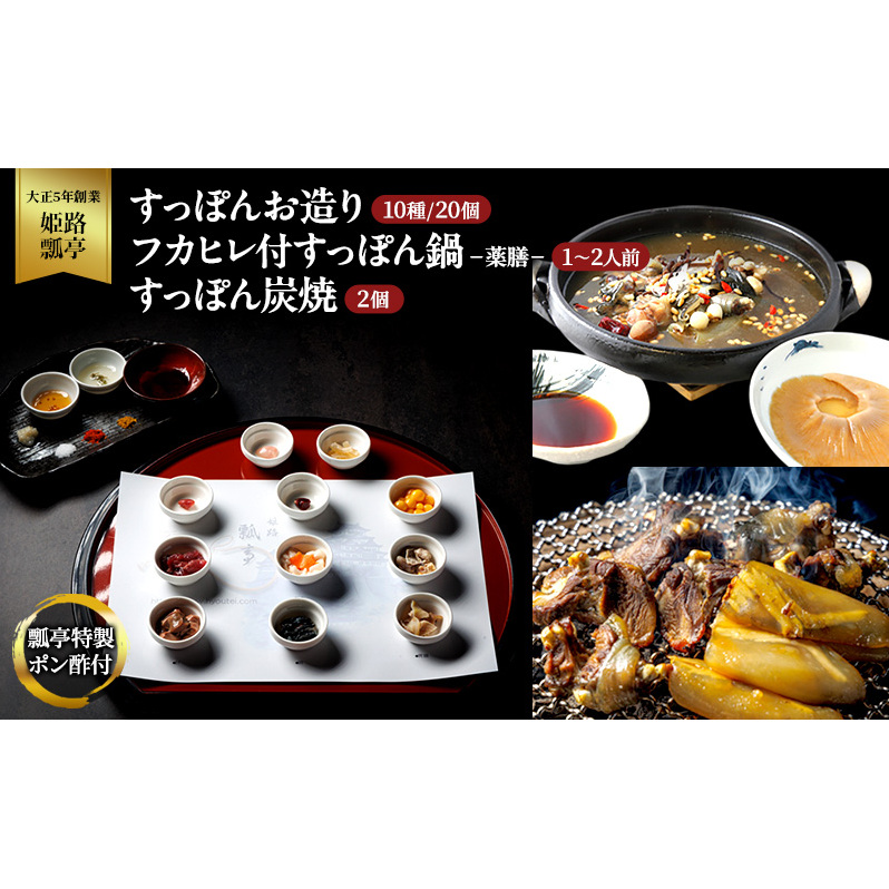 1,776g(すっぽん炭焼100g×2パック、すっぽんお造り10種・20個、瓢亭特製ポン酢150g、フカヒレ付すっぽん鍋(薬膳)セット【1~2人前】1,210g)