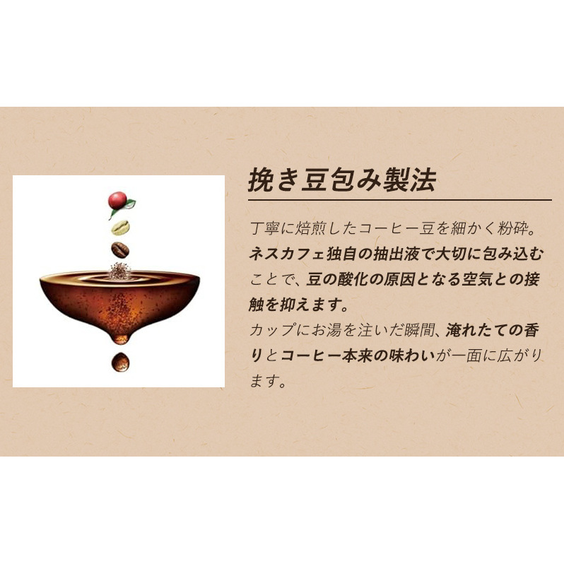深いコクと挽きたての香りネスカフェ独自の「挽き豆包み製法」で、いつでも1杯ずつ、淹れたての味わいをお届け。