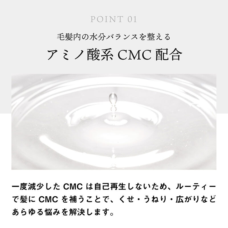 髪のタンパク質とタンパク質の隙間に存在し、水分の保持やトリートメントなどの通り道の役割をもつ物質「CMC」の類似成分を配合。
