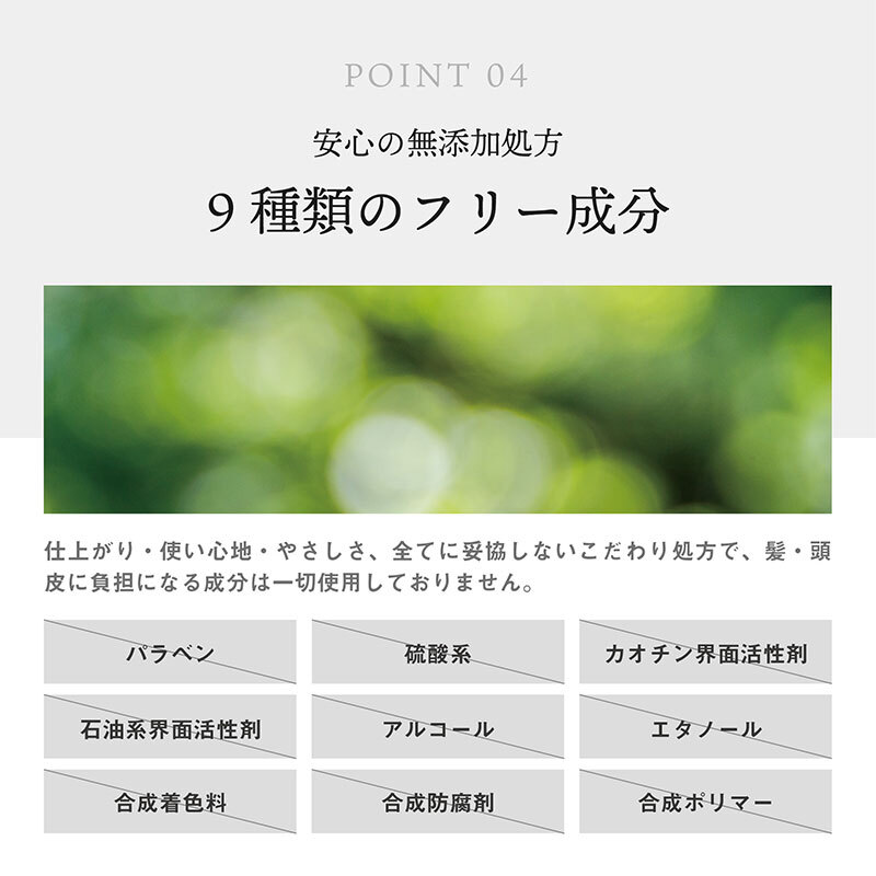 さらに、髪にツヤと潤いを与える植物オイルを贅沢に含み、内側から潤いがあふれ出す素髪の美しさを取り戻します。