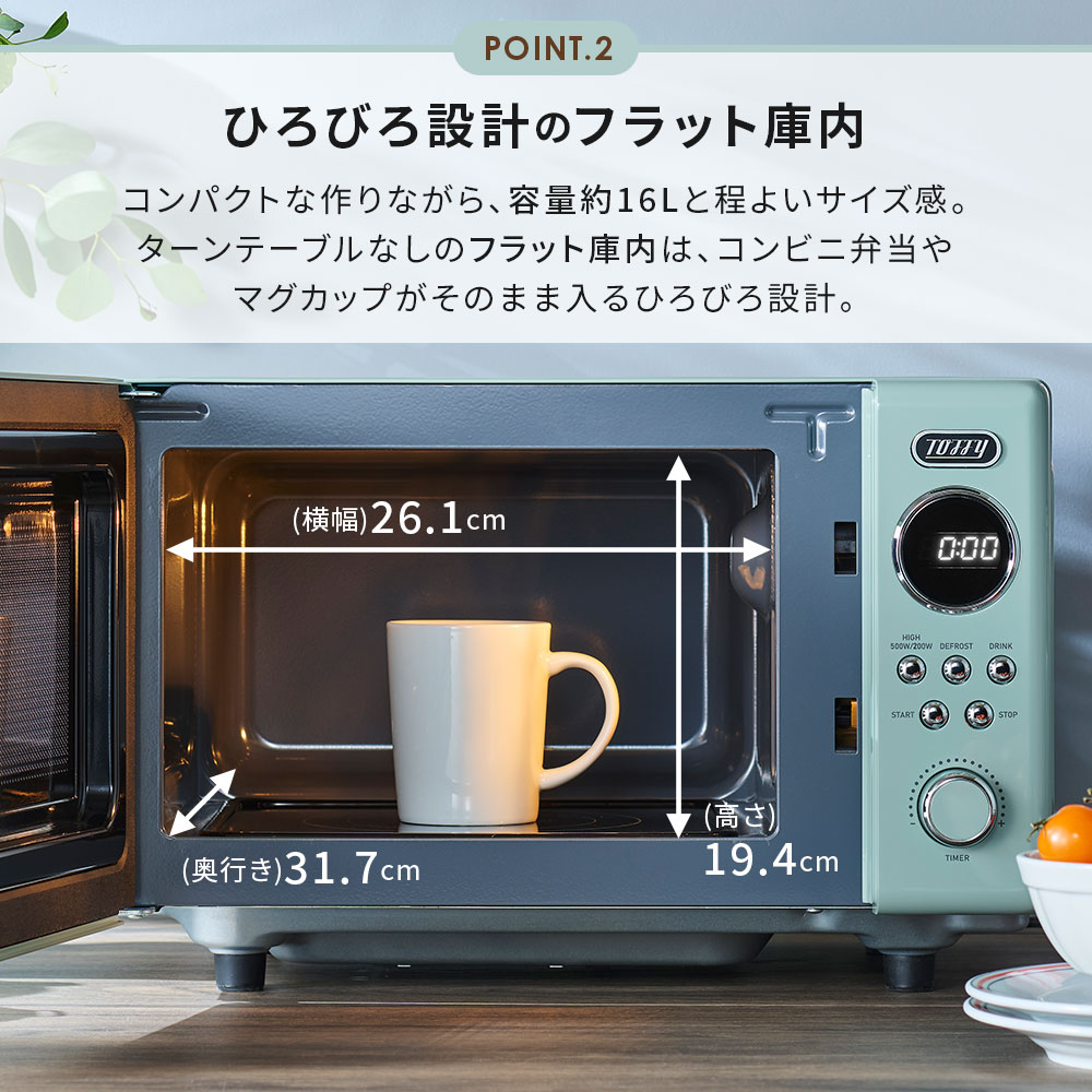 POINT2:ターンテーブルのないフラット庫内は広々使えて、掃除もラクラク!!