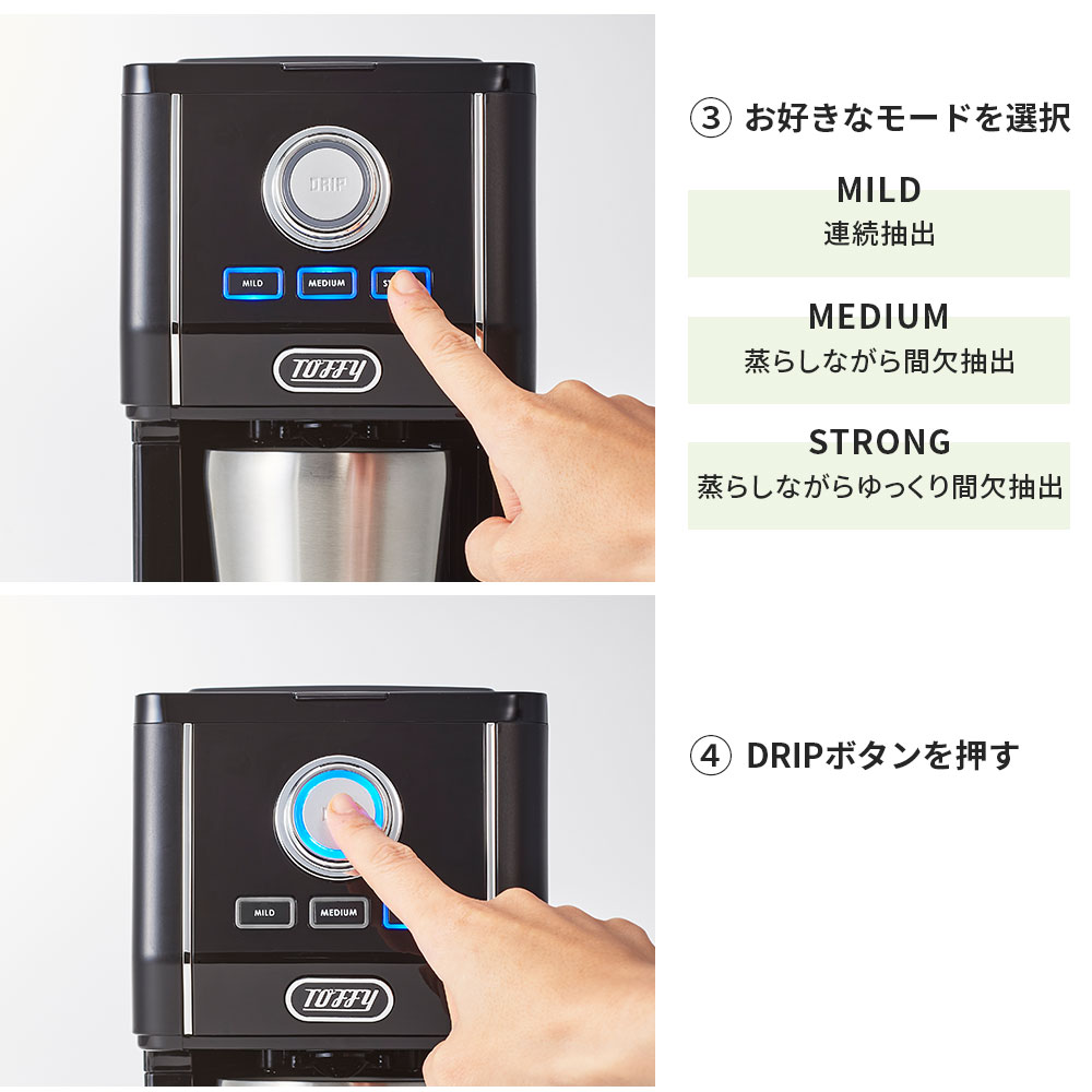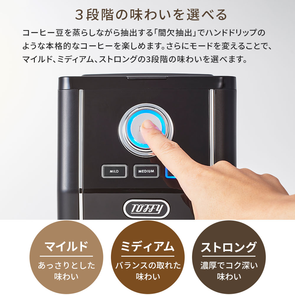 POINT2:『間欠抽出』でハンドドリップのようにコーヒー粉を蒸らしながら抽出。マイルド、ミディアム、ストロングの3段階から味わいが選べます。